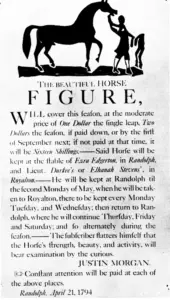 Figure had been at stud in Hartford, Connecticut, in May 1792 before Morgan saw him. Morgan probably acquired Figure in Hartford in late May 1792 and took him to Vermont in June. In 1793 through 1795, Morgan advertised his stallion in several newspapers. Before April 1796, however, he sold Figure, who was advertised that year by another man. Perhaps conscious of his declining health, Morgan sold the horse to acquire land for his children.