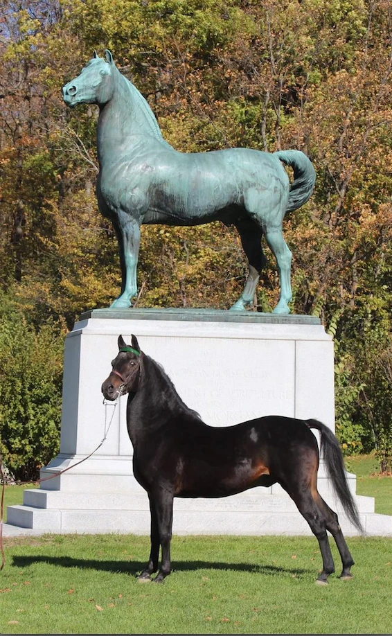 A seal-brown Morgan stallion poses at a monument to Figure (1789–1821), foundation stallion of the Morgan horse breed, at the University of Vermont Morgan Horse Farm at Weybridge. It is said to be one of the few statues in the world featuring a riderless horse. The monument was installed in 1921, the centennial year of Figure’s death. Photo courtesy of Pinterest.