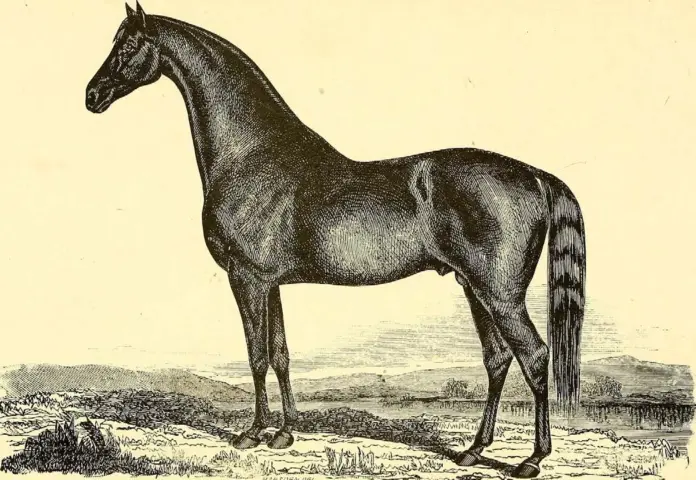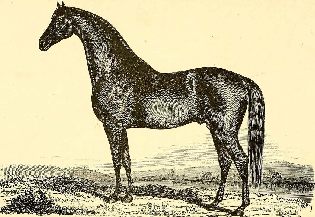 This etching from an 1895 encyclopedia depicts a Morgan horse. Most Morgans are bay, black, or chestnut, but they also can have many other colors. Photo courtesy of Wikipedia Commons.