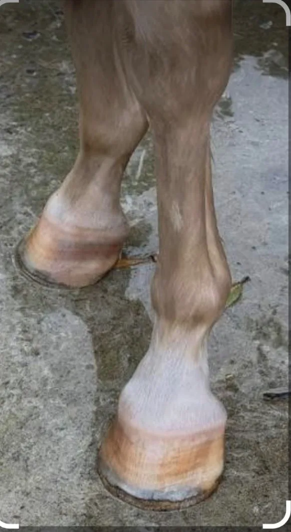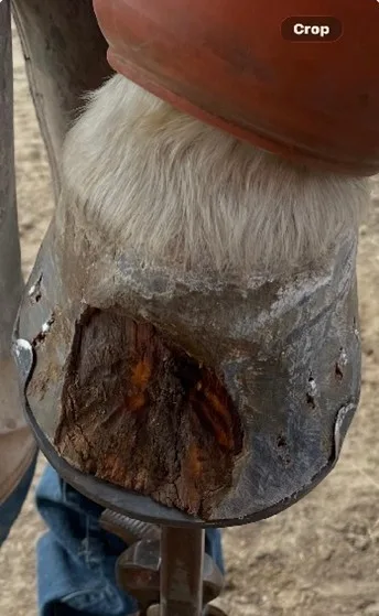 White line disease also becomes more prevalent in spring. The softened hoof wall and increased microbial presence allow pathogens to invade the white line, particularly in horses with flares or long toes. Early signs may be subtle, but unchecked infections can compromise hoof stability and require extensive rehabilitation. As seen in Figures 3 and 4, minor issues can quickly escalate if left untreated.
