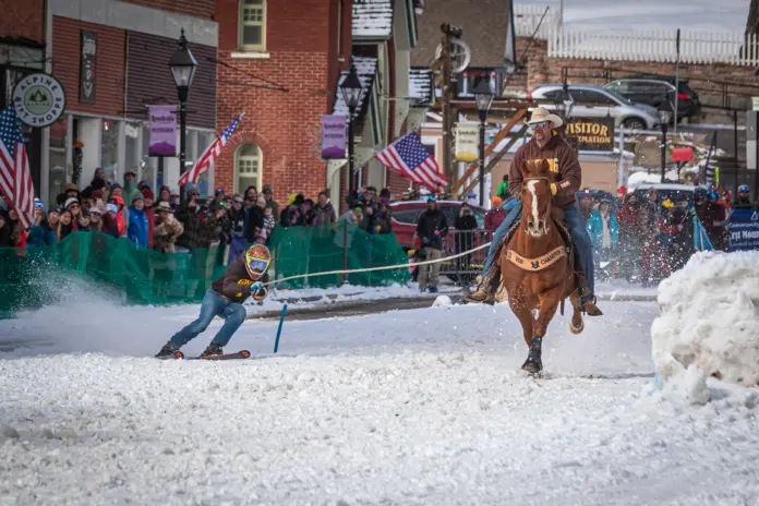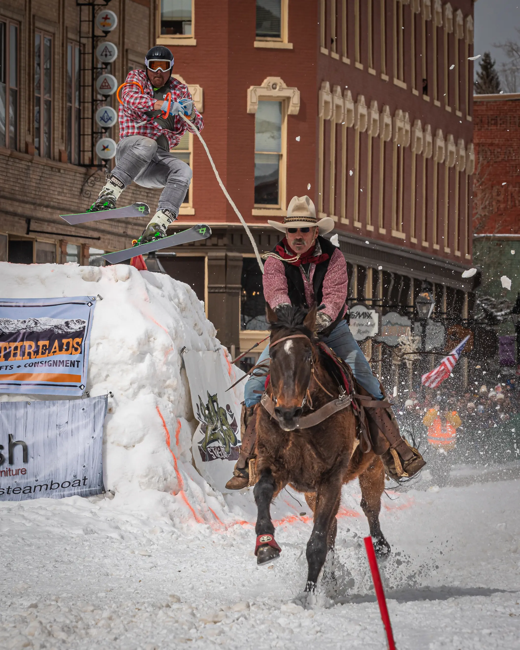 The National Anthem opens the event, then contestants line up for a dose of Wild West adrenaline. As skiers are pulled down Harrison Avenue by a galloping horse and rider, often reaching 40 mph, the skier must neatly land jumps and pick up rings, aiming for the fastest time. Crashing or missing a jump earns a team a “did-not-finish,” while missing a ring adds time to their score.