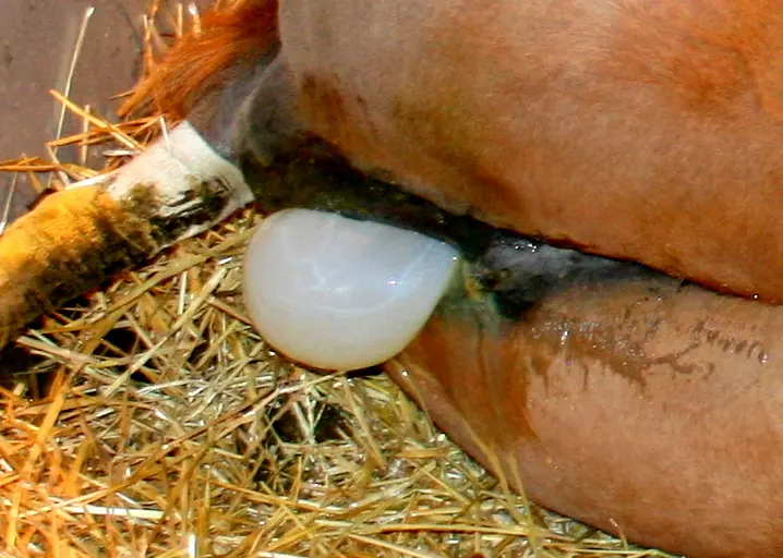 Appearance of the amnion bag during a normal foal delivery. Photo courtesy of Colorado State University Equine Reproductive Laboratory.